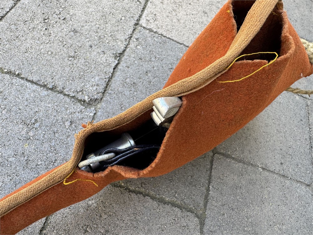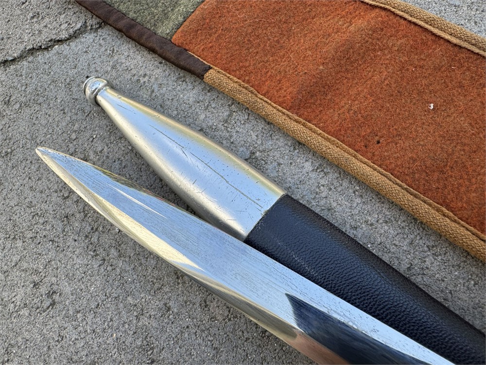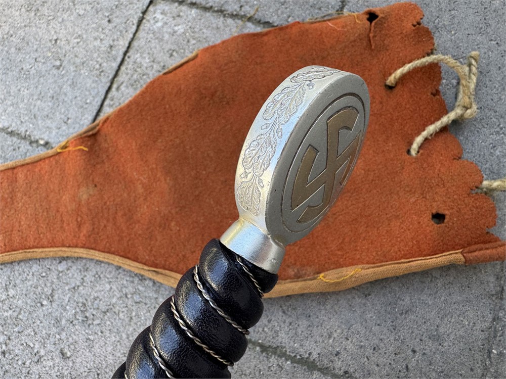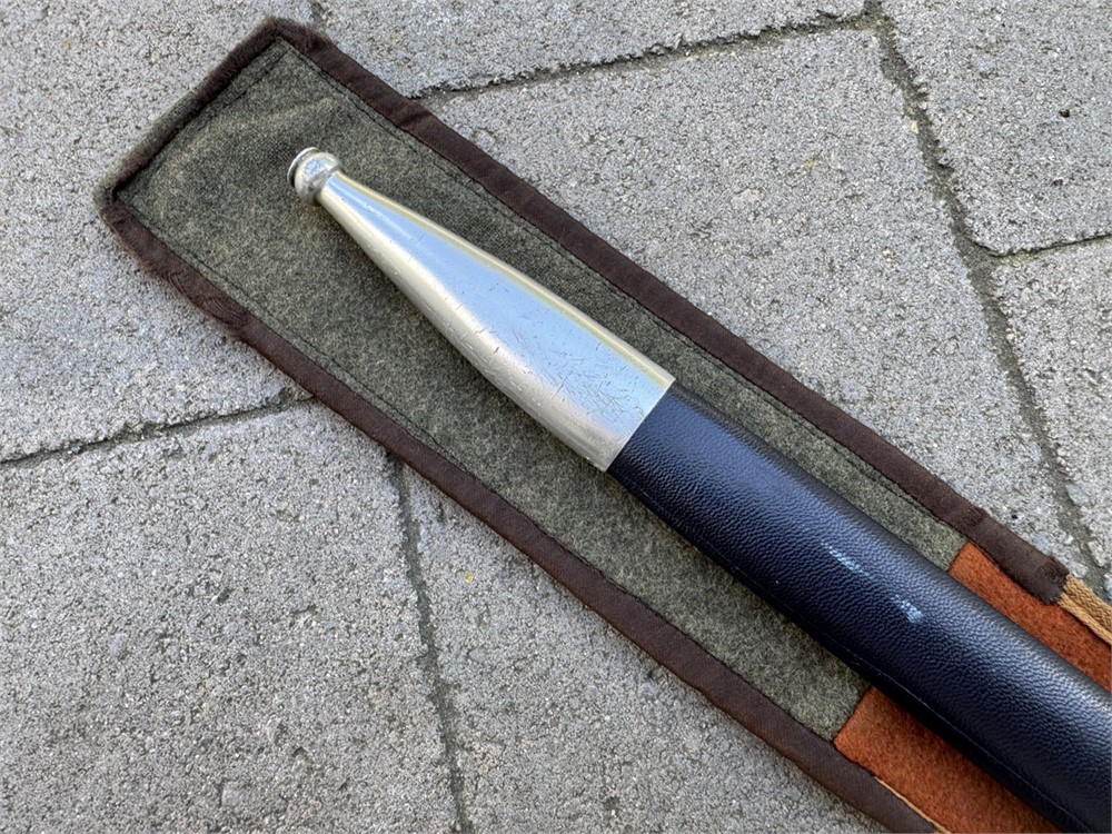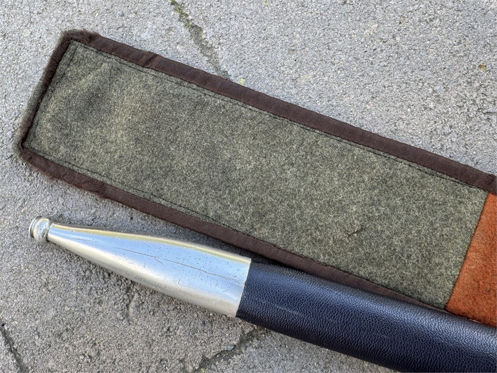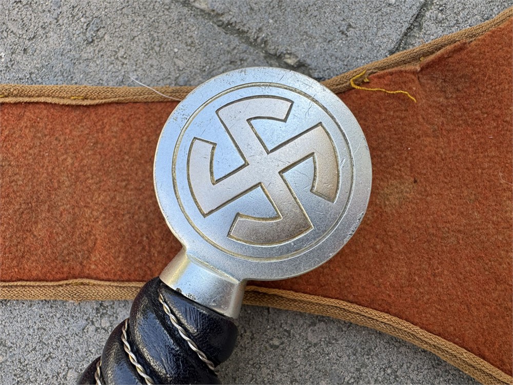 This is one of the better examples you will encounter. But for a couple of scratches to the exterior, this piece would easily grade 99% (I give almost nothing a 100% rating). This condition suggests the storage bag is original to this piece (being the orange color one normally finds with Luftwaffe General Degens). Leather grip and integral hanger are perfect and "like new." Same with scabbard. One tiny rub near the tip (easy to obscure with some blue leather polish). Plated blade is near flawless, except for a TINY bit of age near the tip (see photo - very hard to photograph). Bag shows separation near the handle area (see photos). Overall, an exquisite example that will compete with the finest quality and conditioned specimens in collecting.