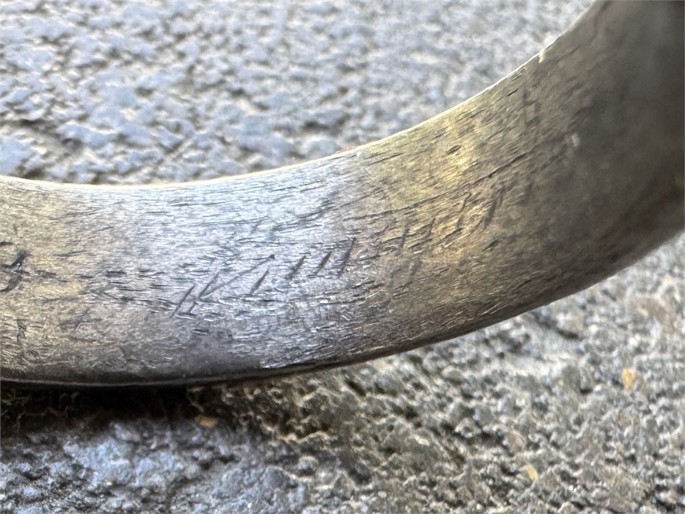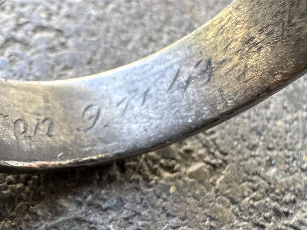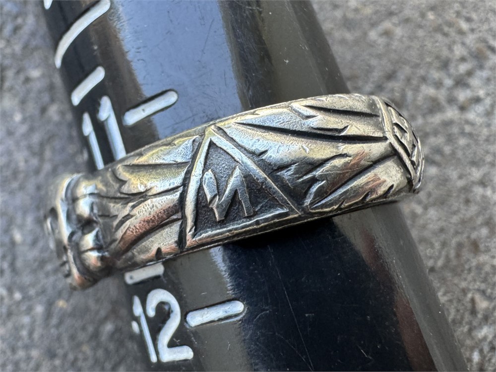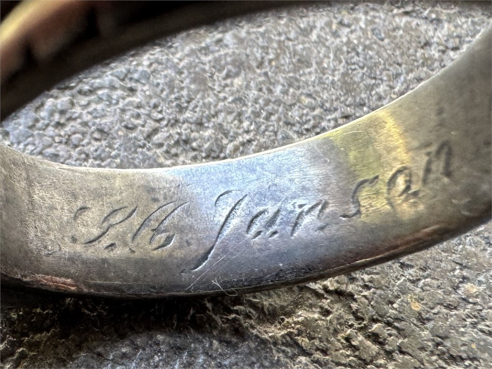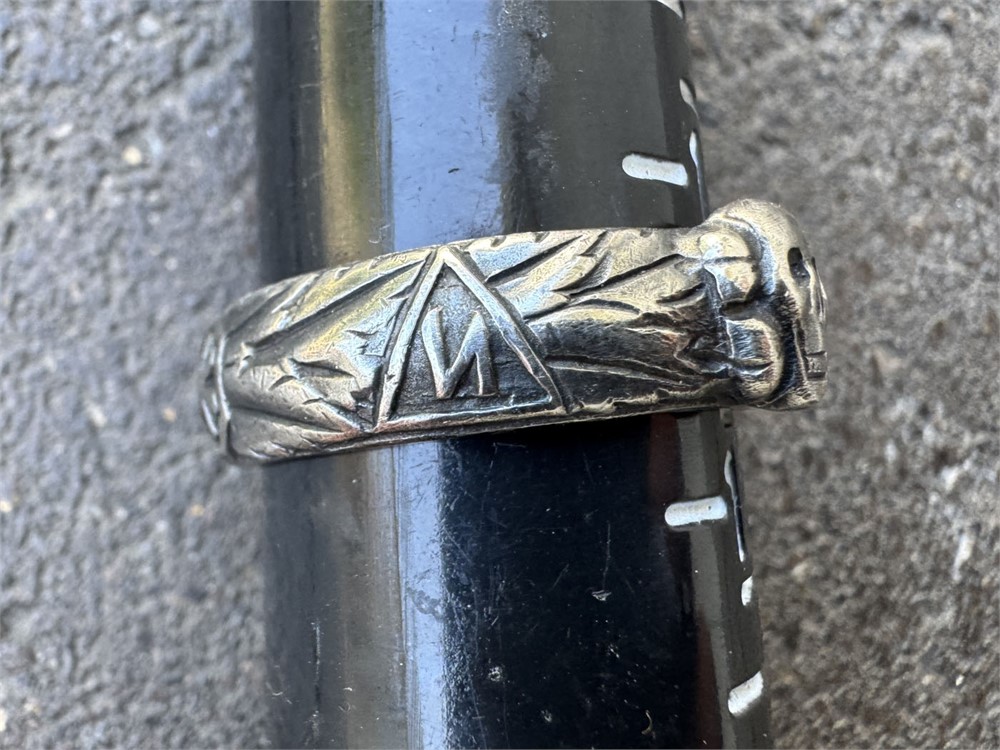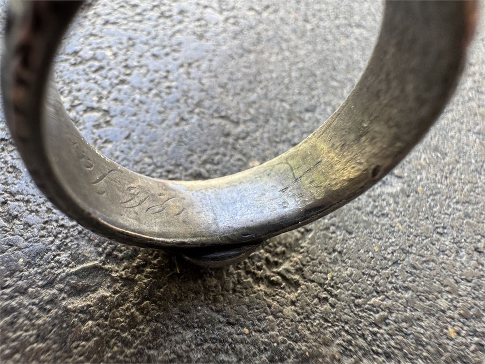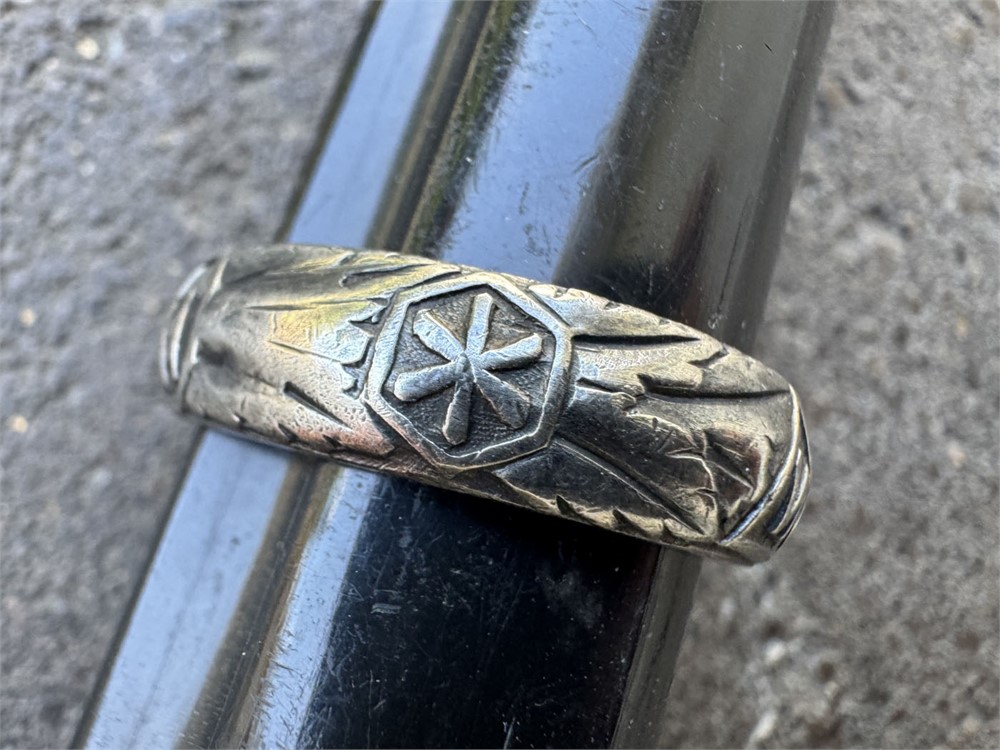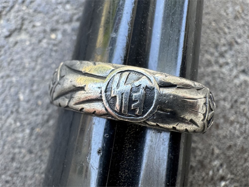 This unresearched Totnekopf Ring was awarded in 1943 (November 9th Putsch anniversary date). The exterior of the ring is in 9.5 out of 10 condition - a spectacular example. The interior has the beginnings of "anonymous-zing" - the owner or the family sought to remove the engraving on the interior. Fortunately, the last name of Jansen, plus the date, are still clearly visible. The Himmler signature is most obscured, but still recognizable. The interior also still exhibits the join-seam behind the skull. Ring has been inspected by both myself (obviously) and Don Boyle and will be accompanied not only by this auction's lifetime guarantee, but a personal COA from both of us (at no additional cost).