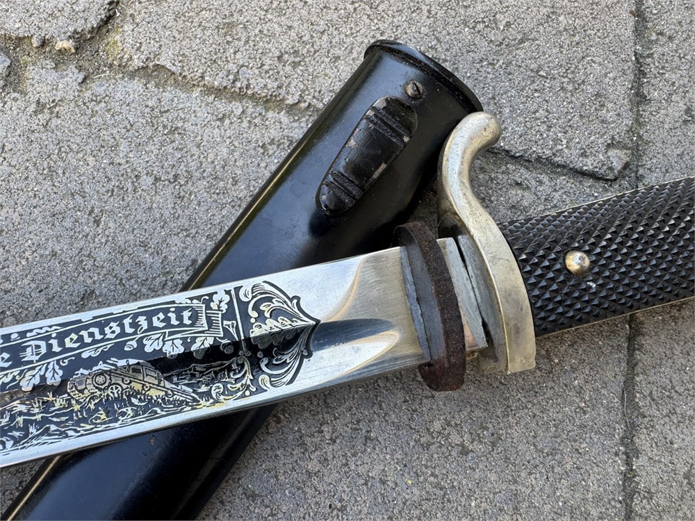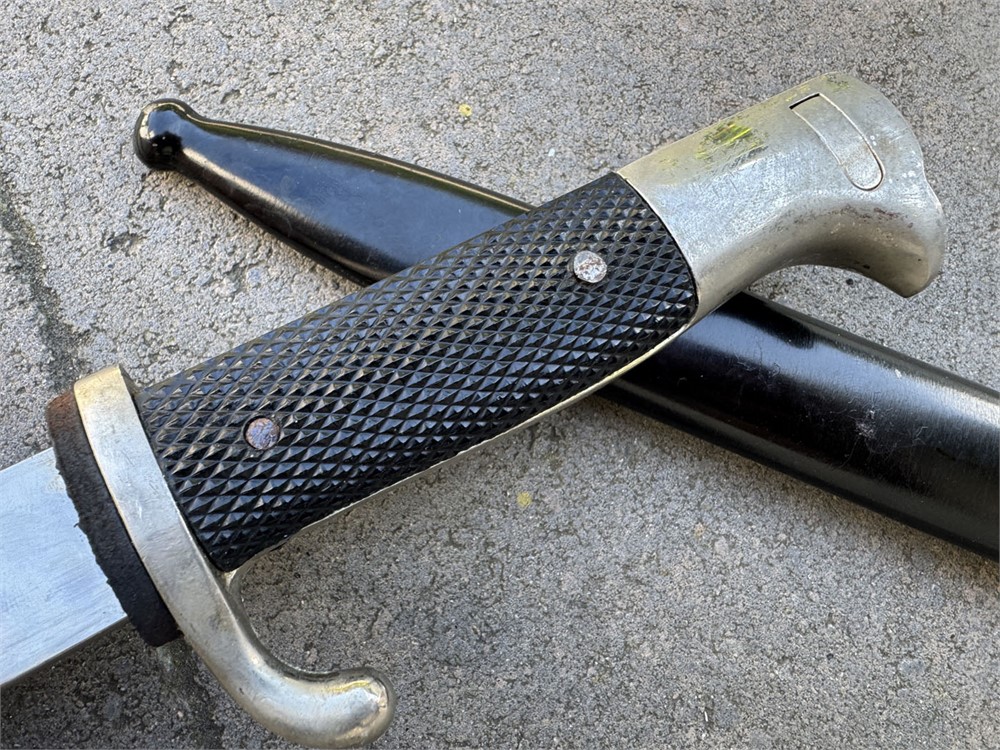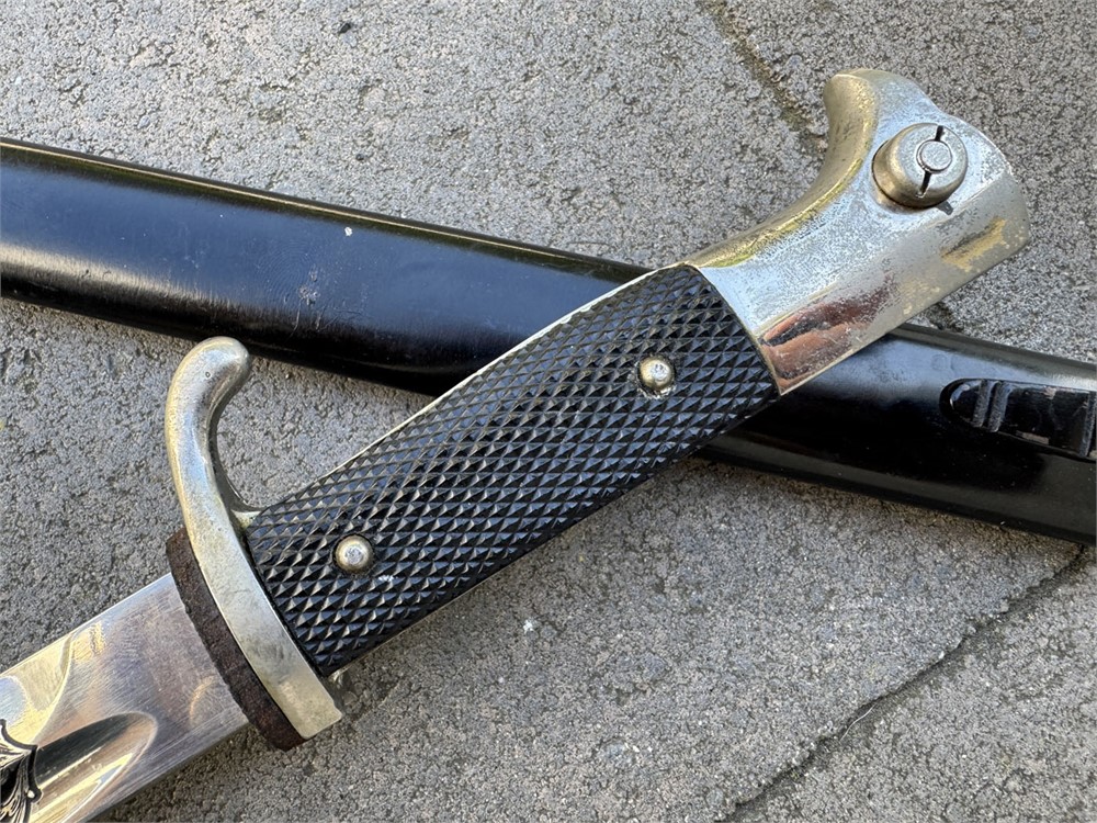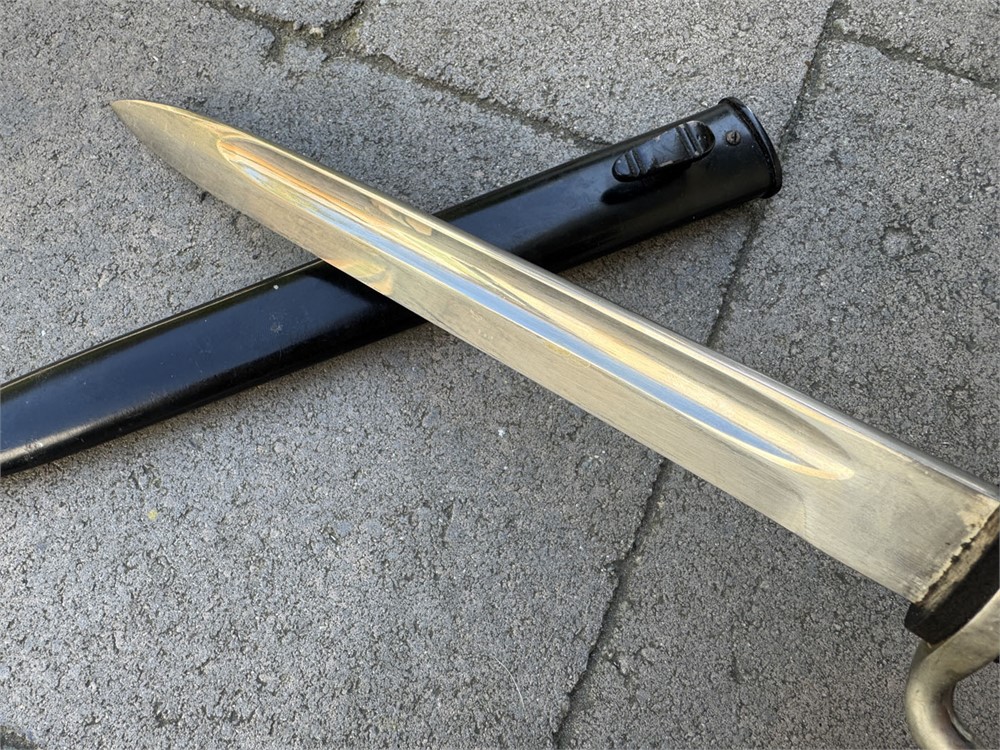 This is an otherwise factory bayonet that is not uncommon. Features a well-preserved blade featuring one of the standard remembrance scenes. The unique part about this bayonet is that the "frosted" background to the etch has been been blued. Also, the high points have remnant of gold plated finish. Without the gold finish (which is mostly gone) I would be suspicious that this deluxe treatment was done post-war. However, the expertise with which the background was blued, plus the "mostly gone" wear to the gold finish, speaks well to the authenticity of this piece such that I am comfortable offering it as original. I can't say that it was factory adorned with the blue and gold, but it is period. Scabbard retain full paint with only minor wear. Note the buffer pad "slides" which is a key sign of an original bayonet - the post-war etched pieces have the buffer pad "pinned" under the bayonet shoulders. I am starting this piece artificially low to encourage bidding and to set the bar "low" so bidders can determine a fair market value.