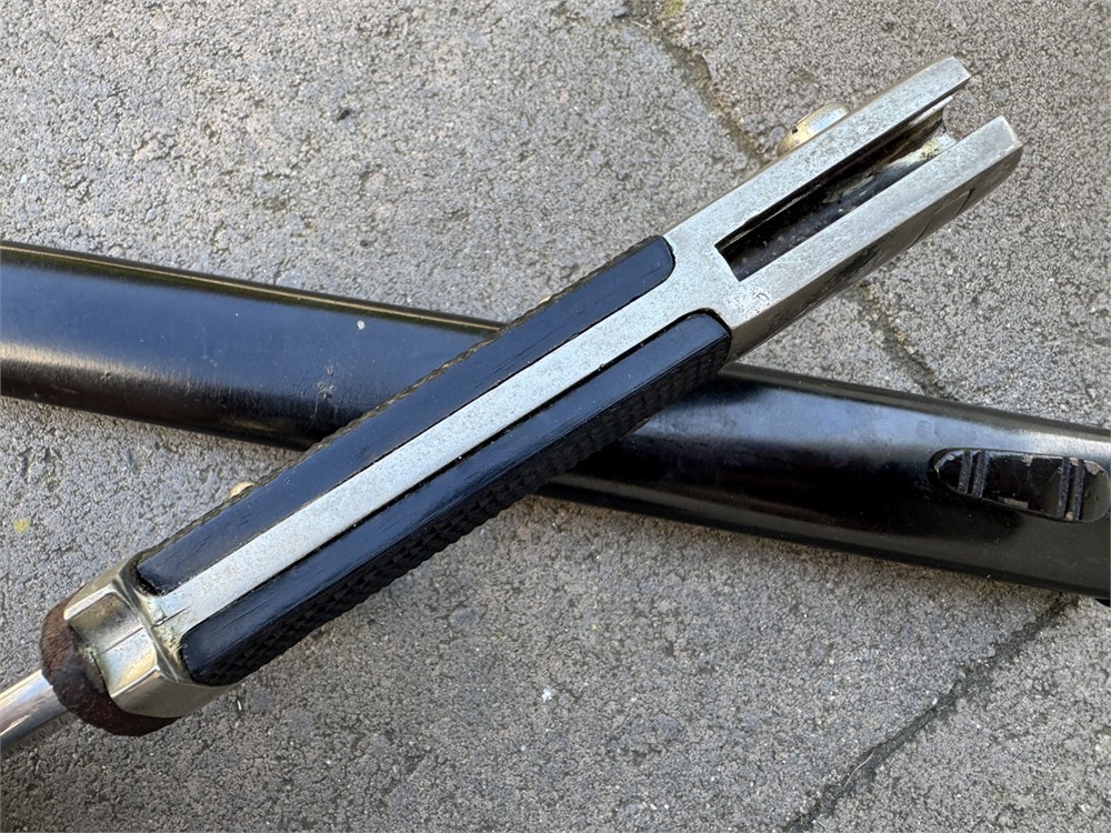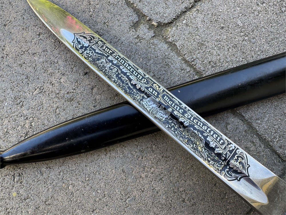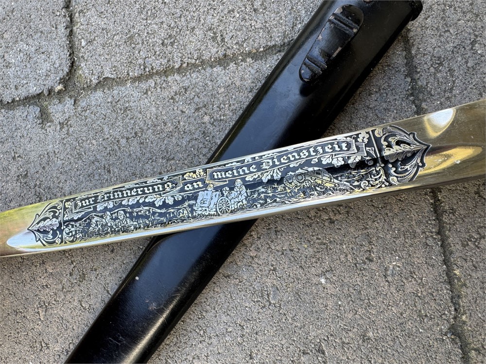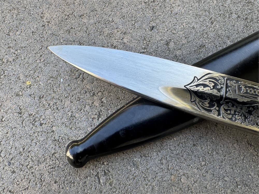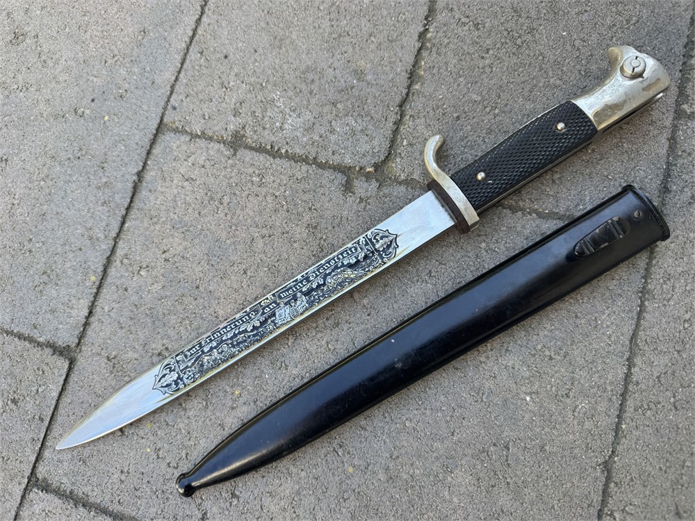 This is an otherwise factory bayonet that is not uncommon. Features a well-preserved blade featuring one of the standard remembrance scenes. The unique part about this bayonet is that the "frosted" background to the etch has been been blued. Also, the high points have remnant of gold plated finish. Without the gold finish (which is mostly gone) I would be suspicious that this deluxe treatment was done post-war. However, the expertise with which the background was blued, plus the "mostly gone" wear to the gold finish, speaks well to the authenticity of this piece such that I am comfortable offering it as original. I can't say that it was factory adorned with the blue and gold, but it is period. Scabbard retain full paint with only minor wear. Note the buffer pad "slides" which is a key sign of an original bayonet - the post-war etched pieces have the buffer pad "pinned" under the bayonet shoulders. I am starting this piece artificially low to encourage bidding and to set the bar "low" so bidders can determine a fair market value.