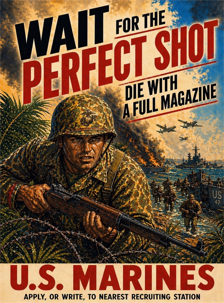 This is original artwork produced by Craig Gottlieb, reminiscent of a World War II-era recruitment poster used by the U.S. Marines. The poster includes the slogan, "Wait for the Perfect Shot, Die with a Full Magazine" is one of Craig's personal slogans he coined. Based upon a similar slogan learned at The Basic School in Quantico, VA ... A good plan executed swiftly is better than the perfect plan never executed. This poster is limited to 100 prints, and will be hand signed and numbered.